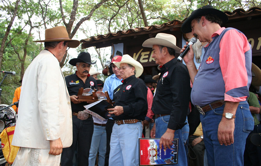 Armando Garcia, João Paulo Martins e Dorival Gonçalves, do clube "Os Independentes", se preparam para entregar o troféu ao comissário.