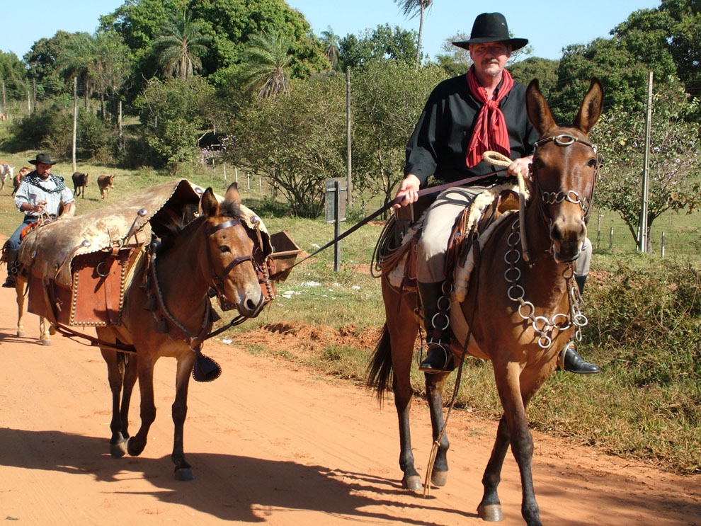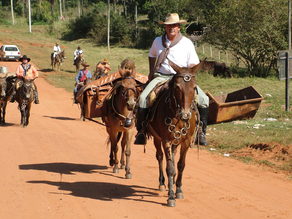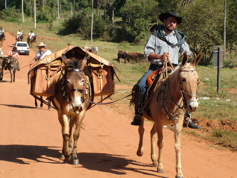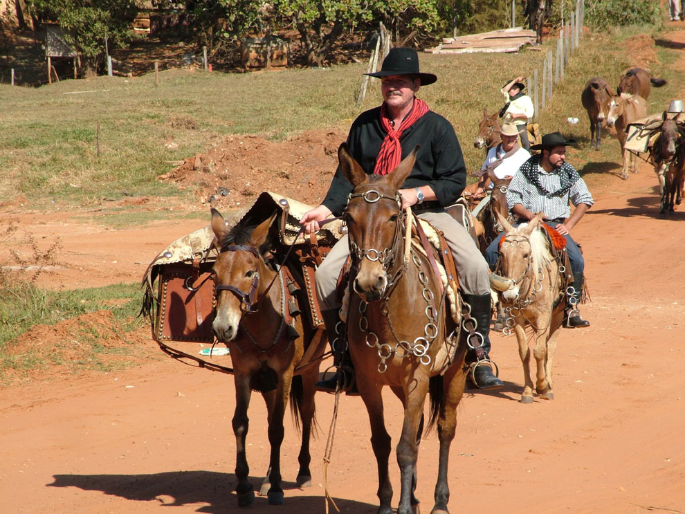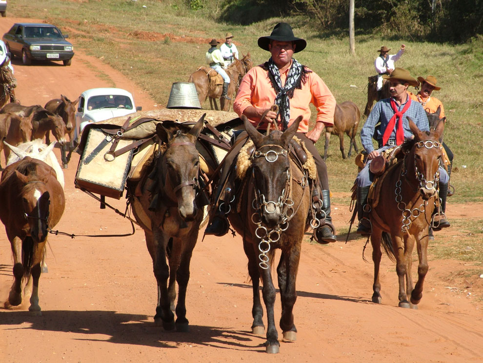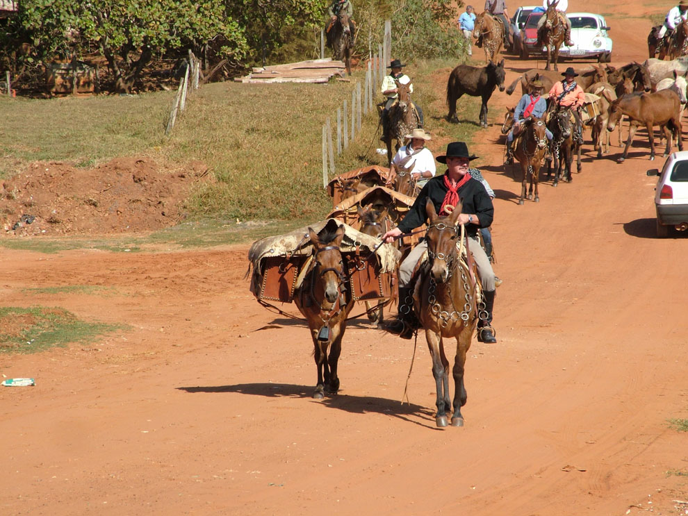 Jorge Aparecido de Souza, o "Jorginho Pequeno", puxa o cargueiro "Mineiro". À direita, lenço vermelho, Nilson Freitas Assunção, o "Neno Carreiro", violeiro da comitiva.