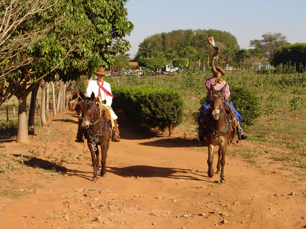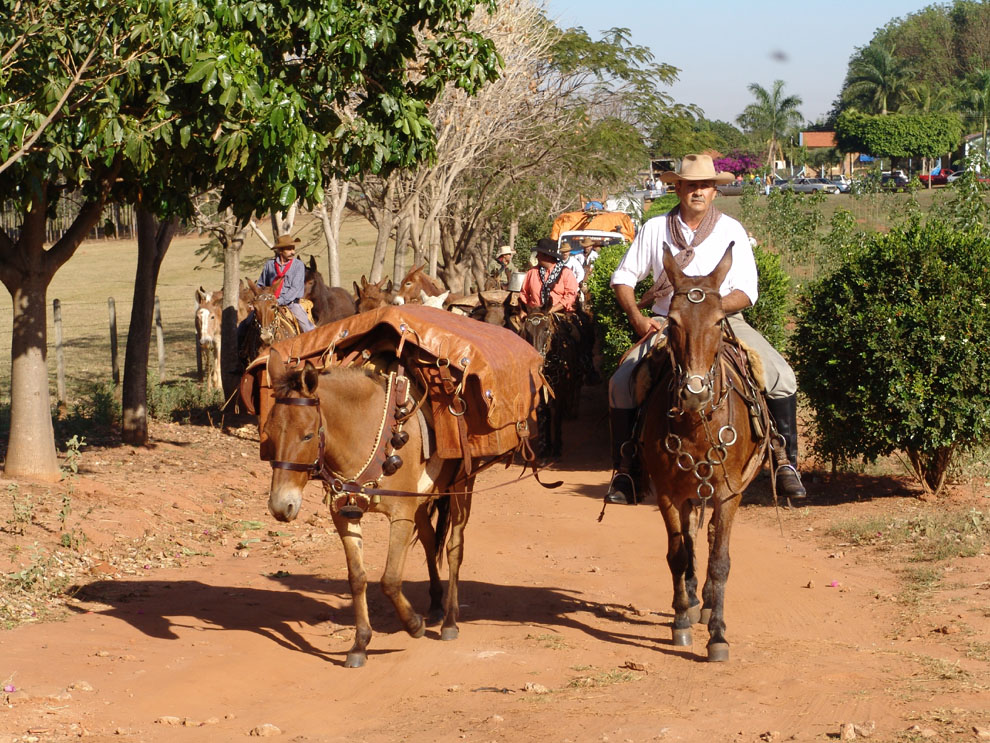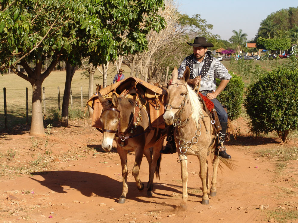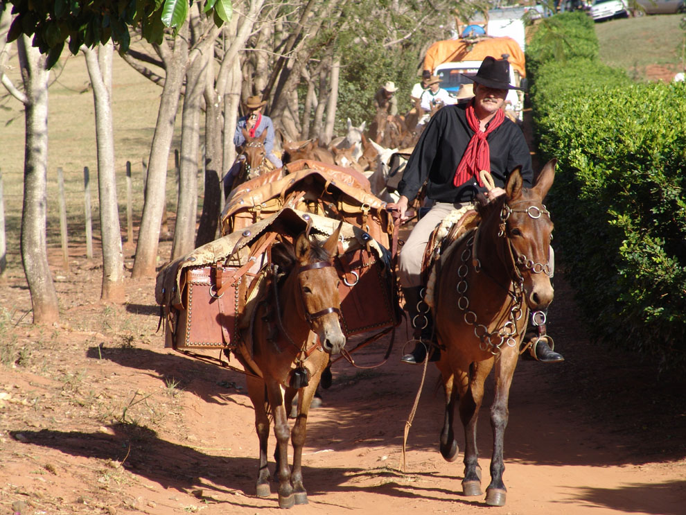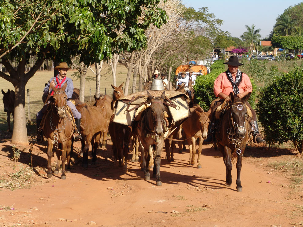Jorge Aparecido de Souza, o "Jorginho Pequeno", puxa o cargueiro "Mineiro". À esquerda, Nilson Freitas Assunção, o "Neno Carreiro", violeiro da comitiva.