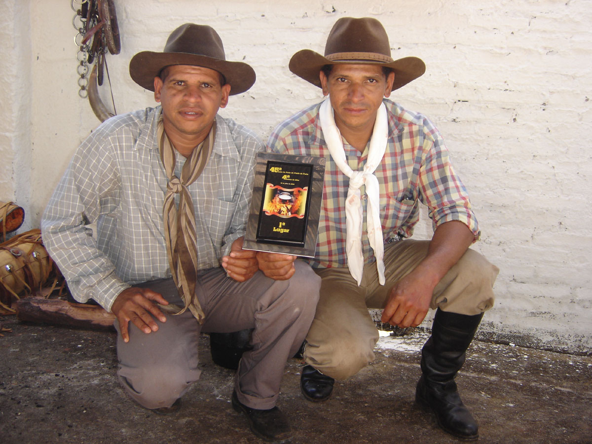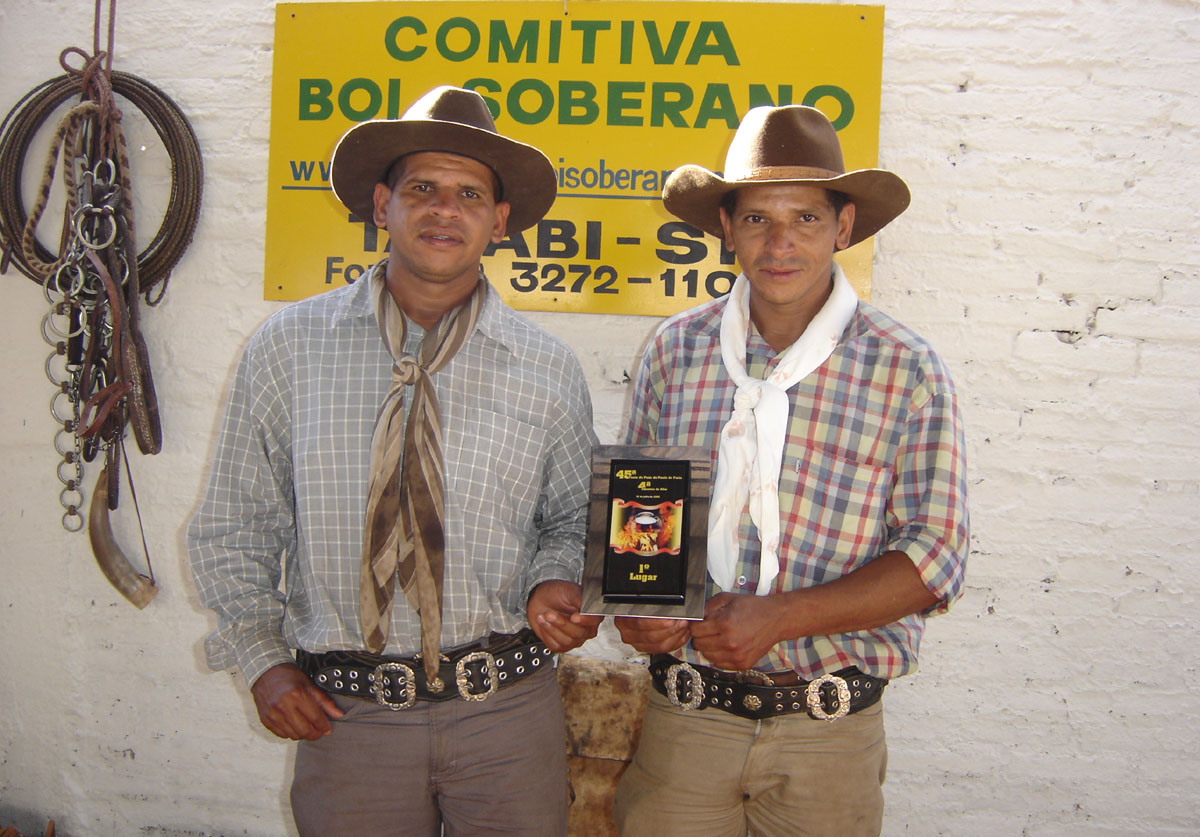 Leandro Perpétuo da Silva, ajudante de cozinheiro, e José Ramos da Silva, cozinheiro, exibem o troféu de campeã ganho pela Comitiva Boi Soberano.