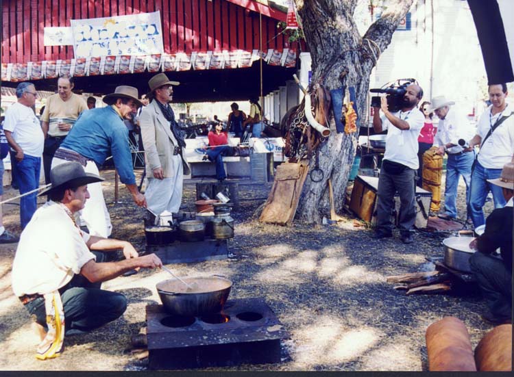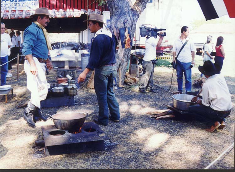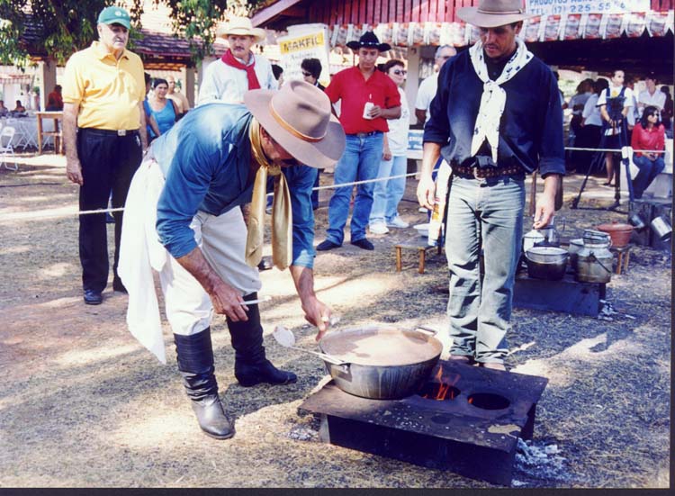 Waltério Meneghete ("Pico"), ajudante de cozinheiro, mexe o feijão gordo. Sérgio da Silva Félix ("Serjão"), cozinheiro, mexe o arroz de carreteiro. O comissário observa. O cinegrafista registra a cena. Ao fundo, João Paulo Martins, do clube "Os Independentes", de Barretos, carrega um dobro. Foto: Rúbio/Tanabi-SP |