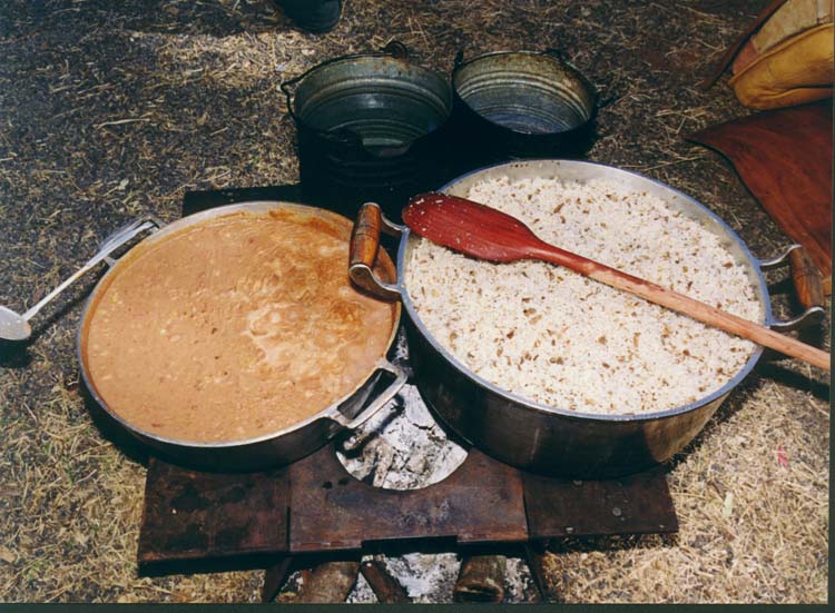 Feijão gordo e arroz de carreteiro (nessas panelas grandes, que é para servir os convidados). Foto: Rúbio/Tanabi-SP |