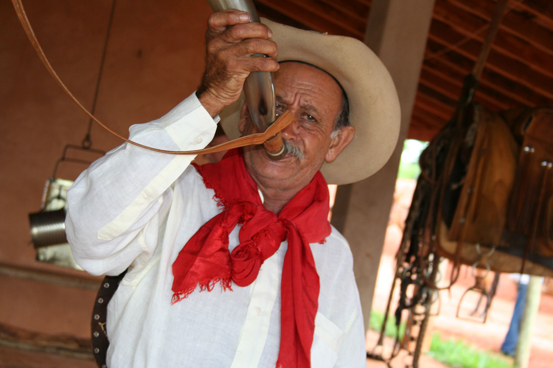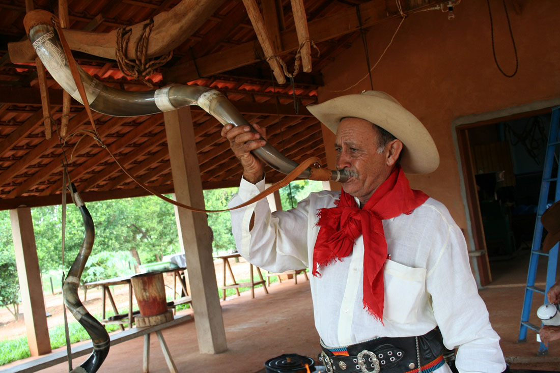 Ílio Lopes, ponteiro de boiada, toca o berrante.