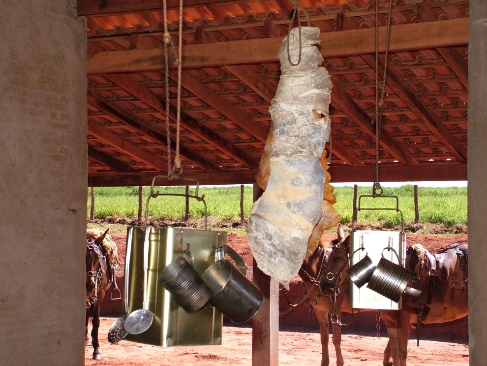 Aspecto da cozinha, com destaque para o charque e a panceta.