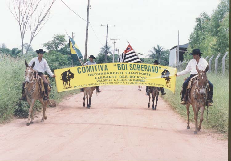 Gustavo Roberto de Oliveira e João Roberto de Oliveira carregam a faixa de apresentação da Comitiva Boi Soberano.