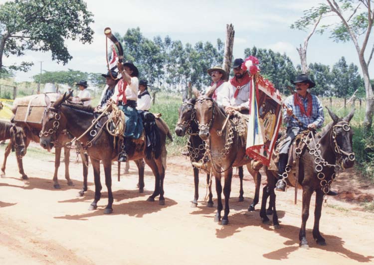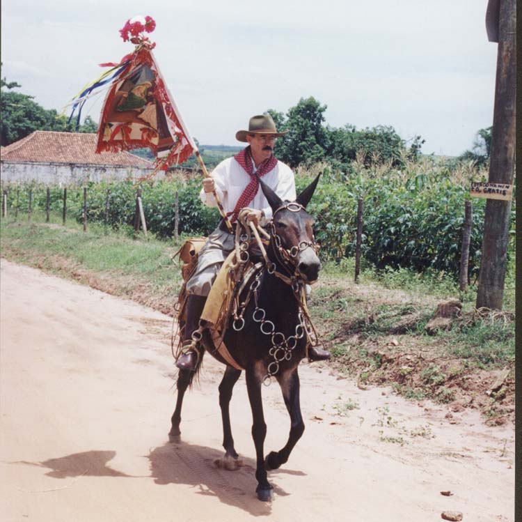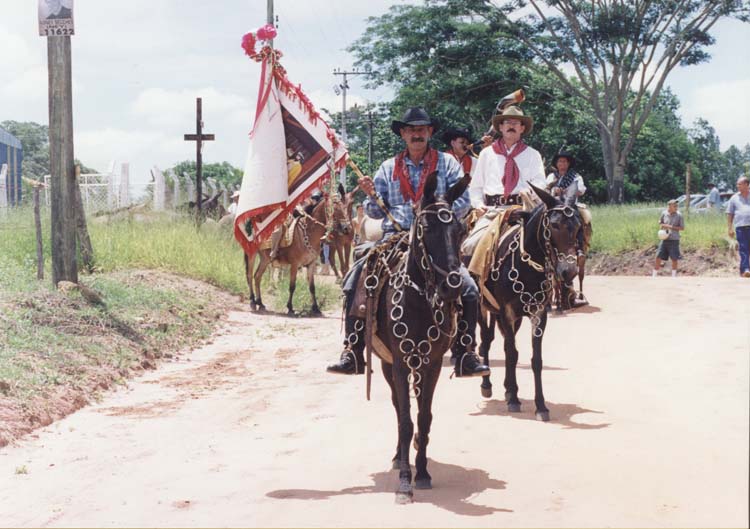 Seo Zé Pequeno chegando com a bandeira dos Santos Reis, seguido dos demais peões.
